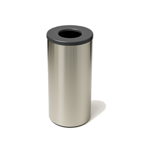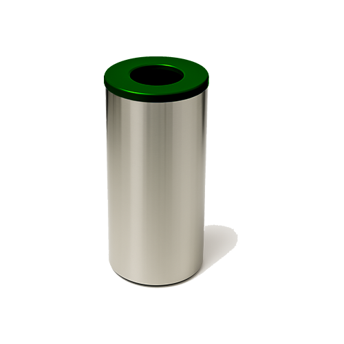 Basurero cilíndrico, tapa cónica de fibra de vidrio en color a escoger, elaborado en acero inoxidable acabado pulido, incluye leyenda en vinil