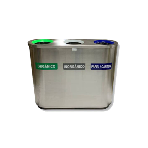 India, basurero con tapa y orificio central en color gris, verde, azul o naranja, elaborado en acero inoxidable acabado pulido, con zoclo y arillo interior para sujetar bolsa, incluye leyenda en vinil