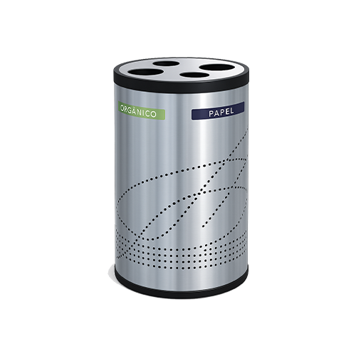 Basurero ecológico cilíndrico cuádruple punzonado, elaborado en acero inoxidable acabado pulido, con tapa de 4 entradas, incluye leyendas en vinil