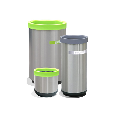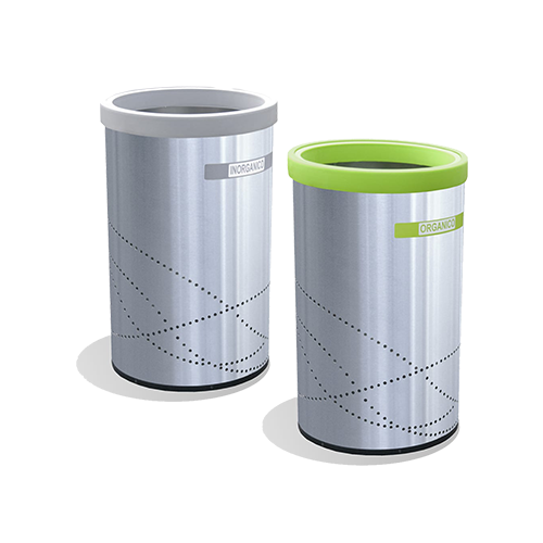 Basurero cilíndrico con tapa verde o gris, solo aro, elaborado en acero inoxidable acabado pulido, con fondo de plástico negro (también disponible con fondo galvanizado), incluye leyenda en vinil (salvo BACI 50)