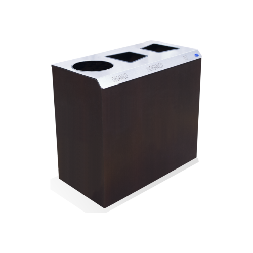 Basurero rectangular triple office, tapa de acero con 3 entradas, cuerpo acabado con laminado tipo madera, incluye leyendas en vinil.