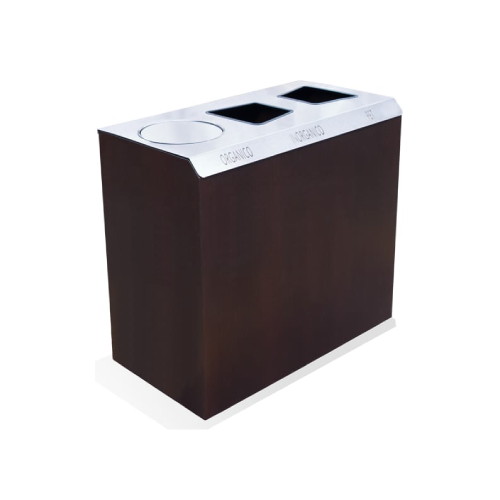 Basurero rectangular triple office, tapa de acero con tres entradas (una con balancín), cuerpo acabado con laminado tipo madera, incluye leyendas en vinil