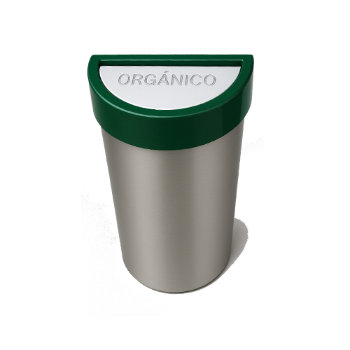 Basurero semicírculo con tapa de fibra de vidrio en color a escoger y balancín, elaborado en acero inoxidable acabado pulido