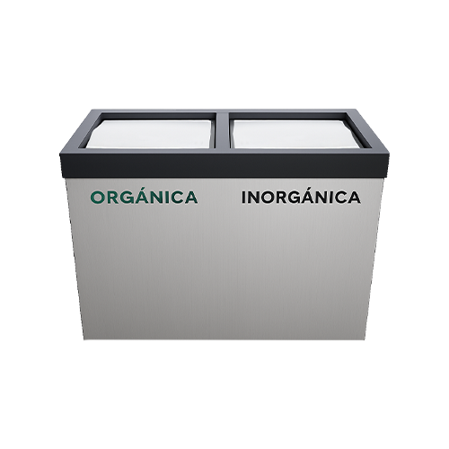 Basurero ecológico rectangular dúplex con tapa negra y doble balancín, elaborado en acero inoxidable acabado pulido, incluye leyendas en vinil