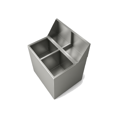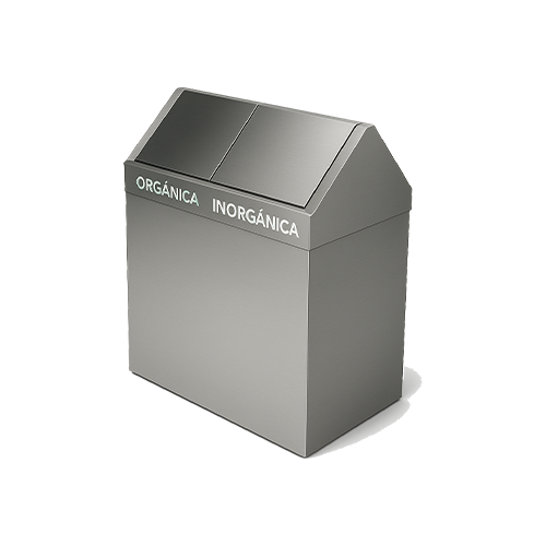 Basurero ecológico rectangular dúplex con tapa tipo pirámide y doble balancín, elaborado en acero inoxidable acabado pulido, incluye leyendas en vinil
