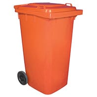 Contenedor con tapa y ruedas elaborado en polietileno de alta densidad, disponible en varios colores.Medidas: 58 x72 x 100 cms. de altura. Capacidad: 240 litros