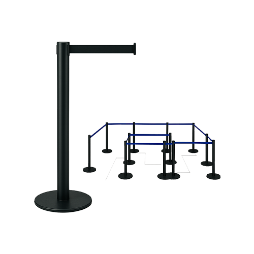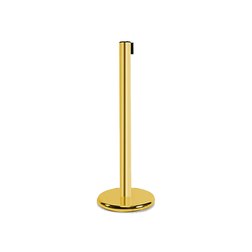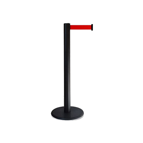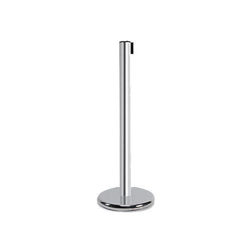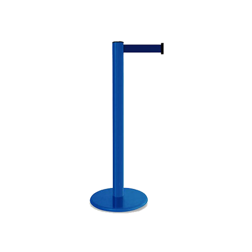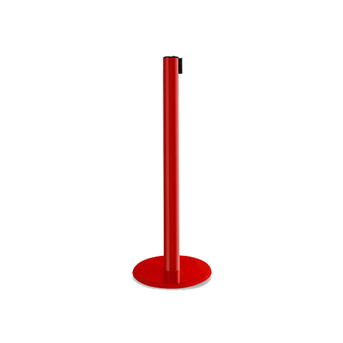 Poste Nueva Generación Universal, de 100cms de altura, tubo y cabeza de 3” de diámetro, base de fierro de 35cms de diámetro y 10kgs de peso, cinta de 5cms de ancho por 2.30m de largo en color a escoger, con seguro en el macho y sistema de regresado lento